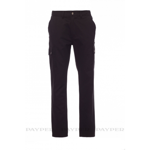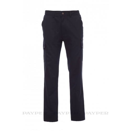 Pantalone uomo, multistagione, elastici laterali e passanti in vita, chiusura con zip e bottone in metallo, due tasche anteriori a taglio classico, due tasche laterali con patta e bottoni automatici, una tasca con zip lato sinistro, un porta metro a scomparsa lato destro, due tasche posteriori a filo con asola e bottone.
