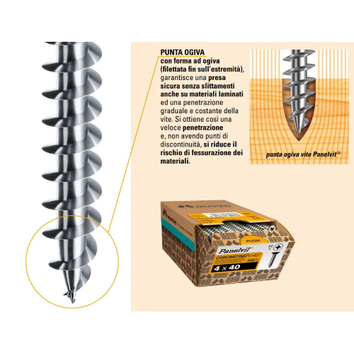 con forma ad ogiva (filettata fin sullestremità), garantisce una presa sicura senza slittamenti anche su materiali laminati ed una penetrazione graduale e costante della vite.
