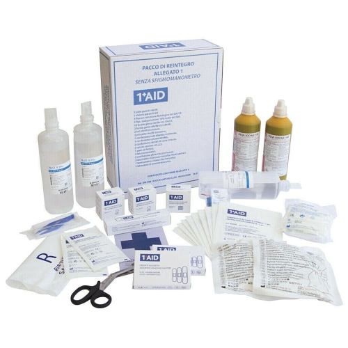 Kit di reintegro allegato 1 senza sfigmomanometro per cassette ed armadietti di pronto soccorso fornito in comodo contenitore antiurto in cartone. prodotto comunemente utilizzato per il pronto soccorso di emergenza in aziende o unità produttive del gruppo a e b e comunque con 3 o più lavoratori. completo di presidi come da tabella in basso.